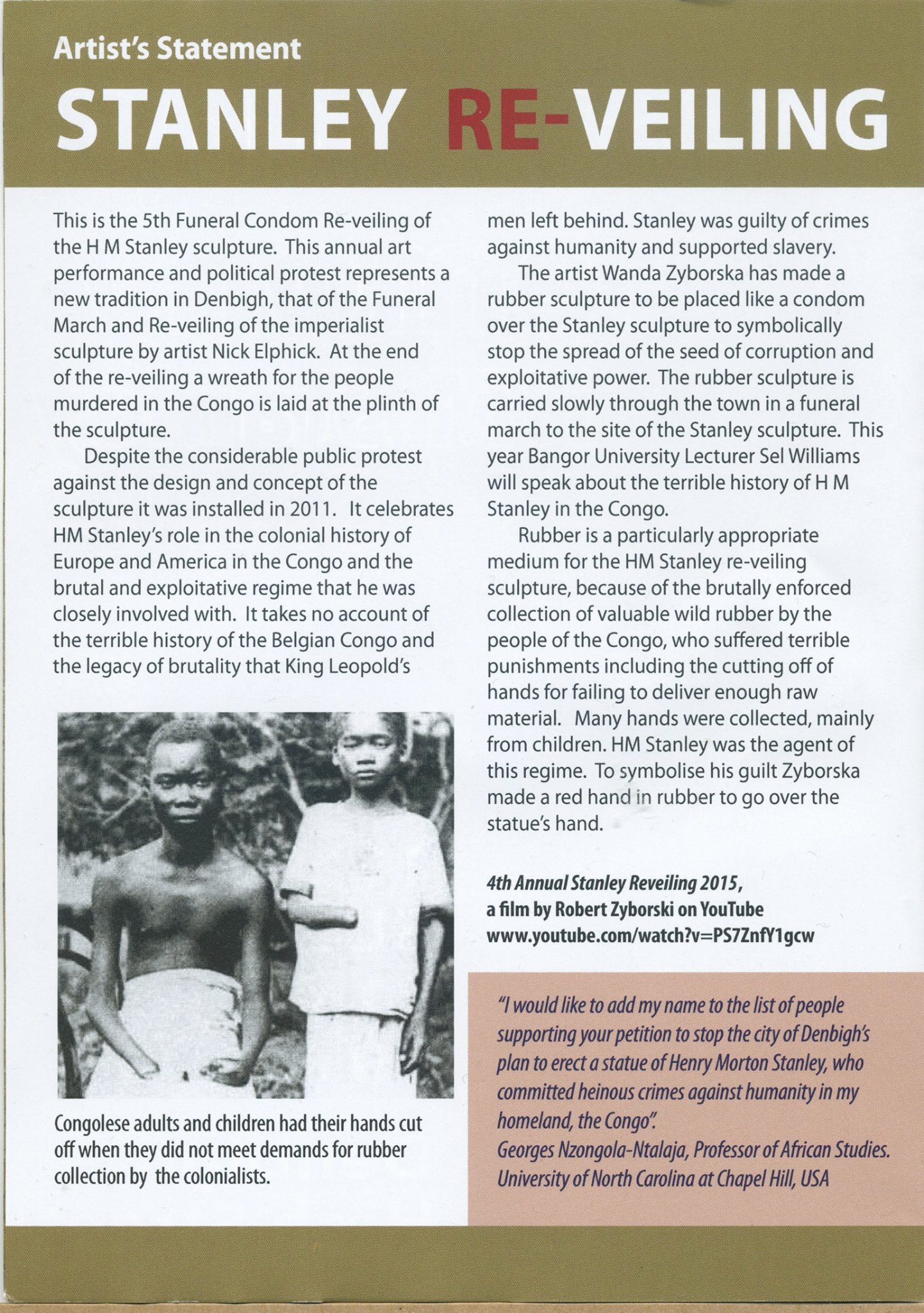 The many protestors say that Stanley was part of a brutal and exploitive regime that resulted in millions of Congolese being killed. They cover the statue in a rubber "condom" to symbolically stop the spread of the "seed" of corruption and exploitative power. A wreath is laid to commemorate those murdered in the Congo.