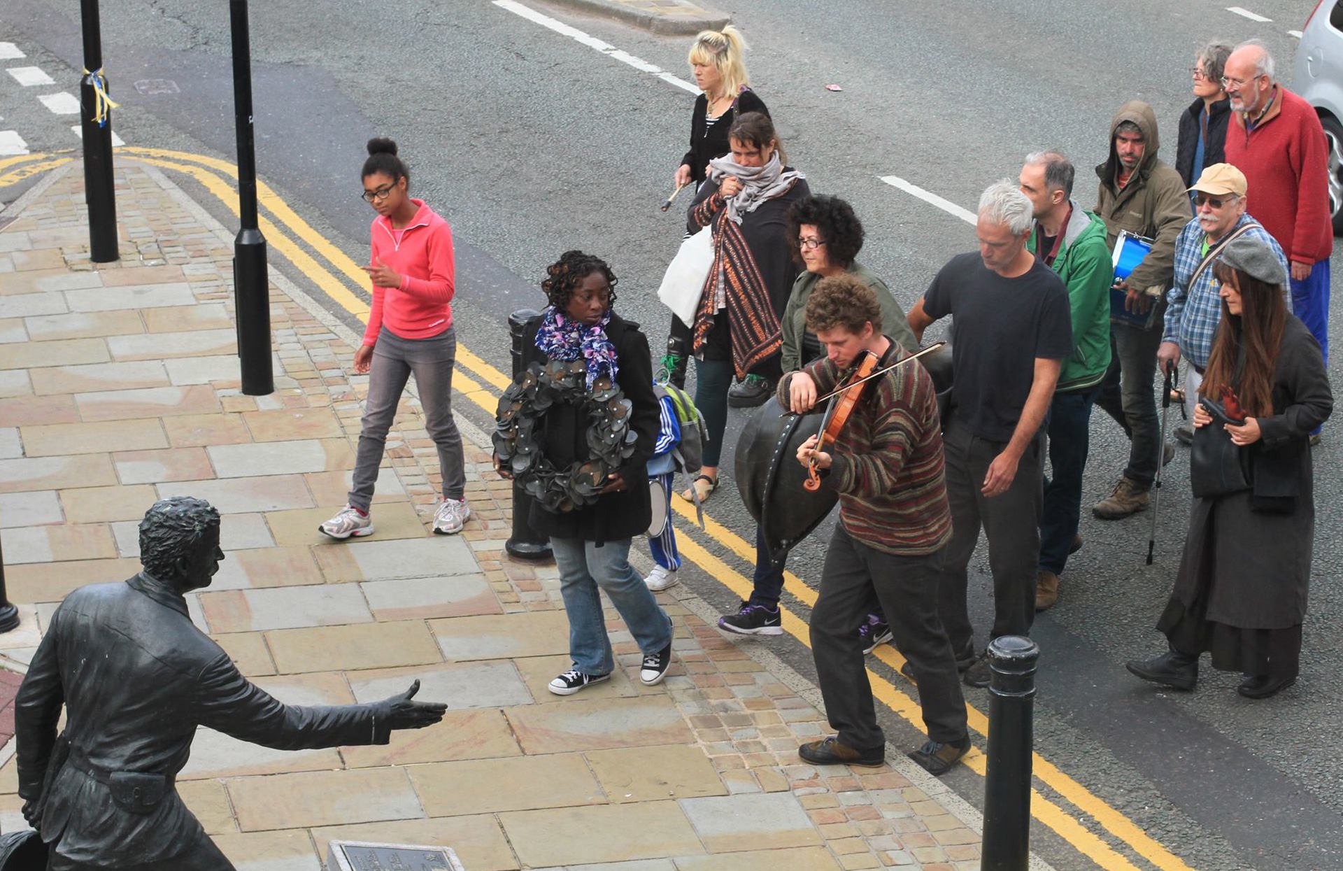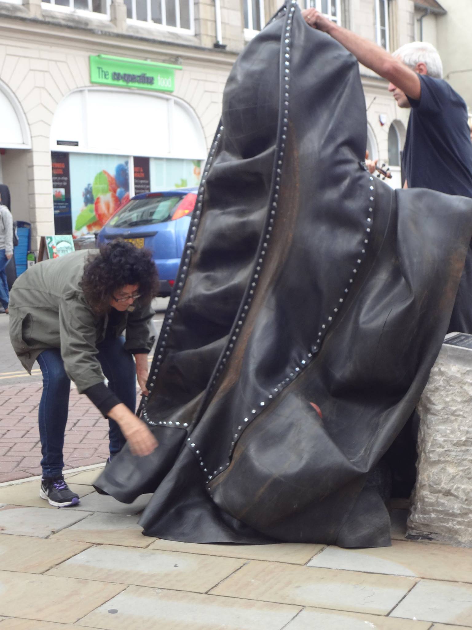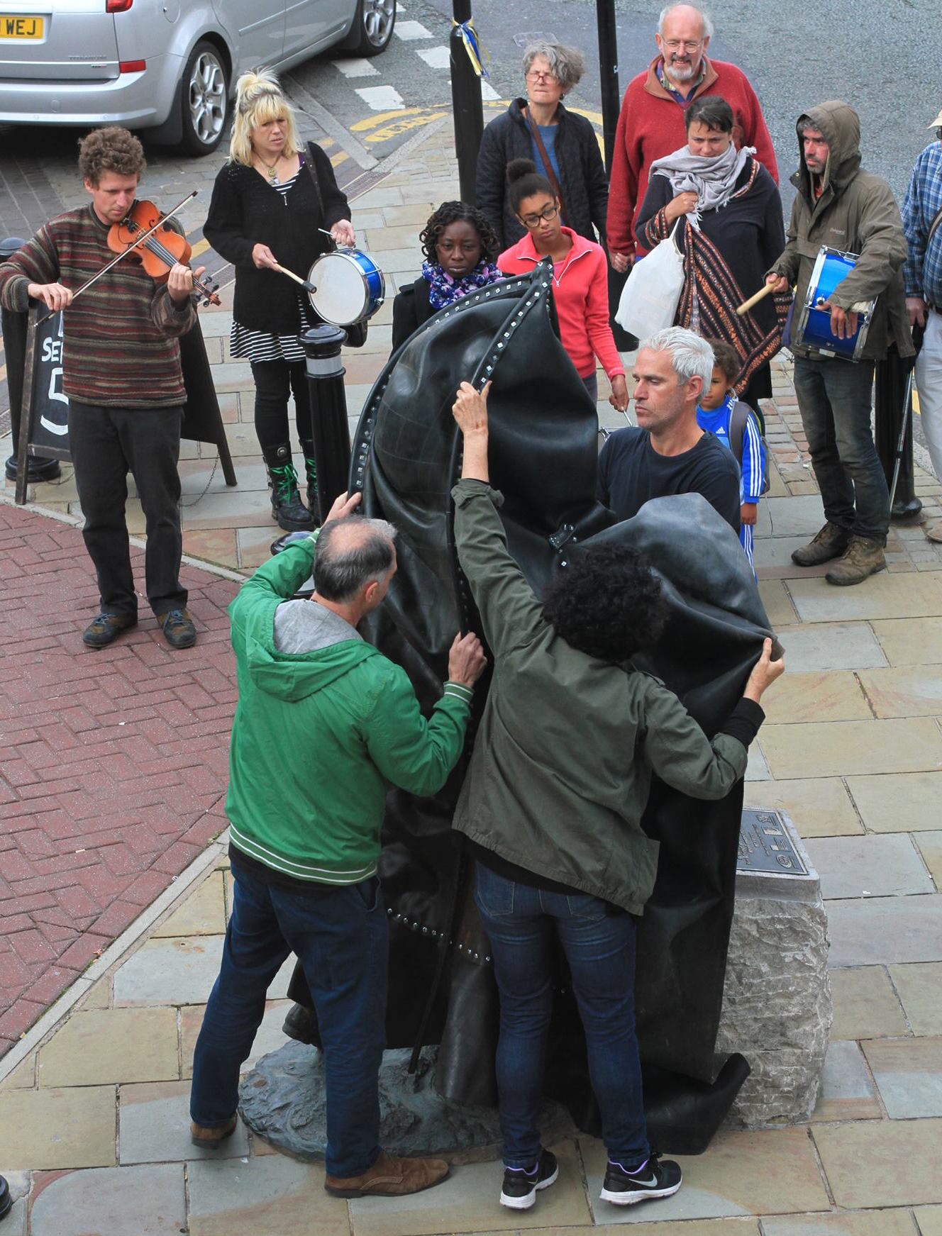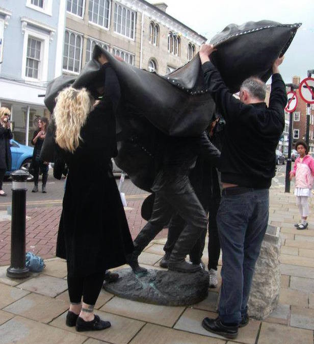 In Denbigh artist Wanda Zyborska has developed an annual ritual re-veiling of the controversial civic statue of H.M. Stanley as part of a public protest about a man who supported slavery and was guilty of crimes against humanity.
