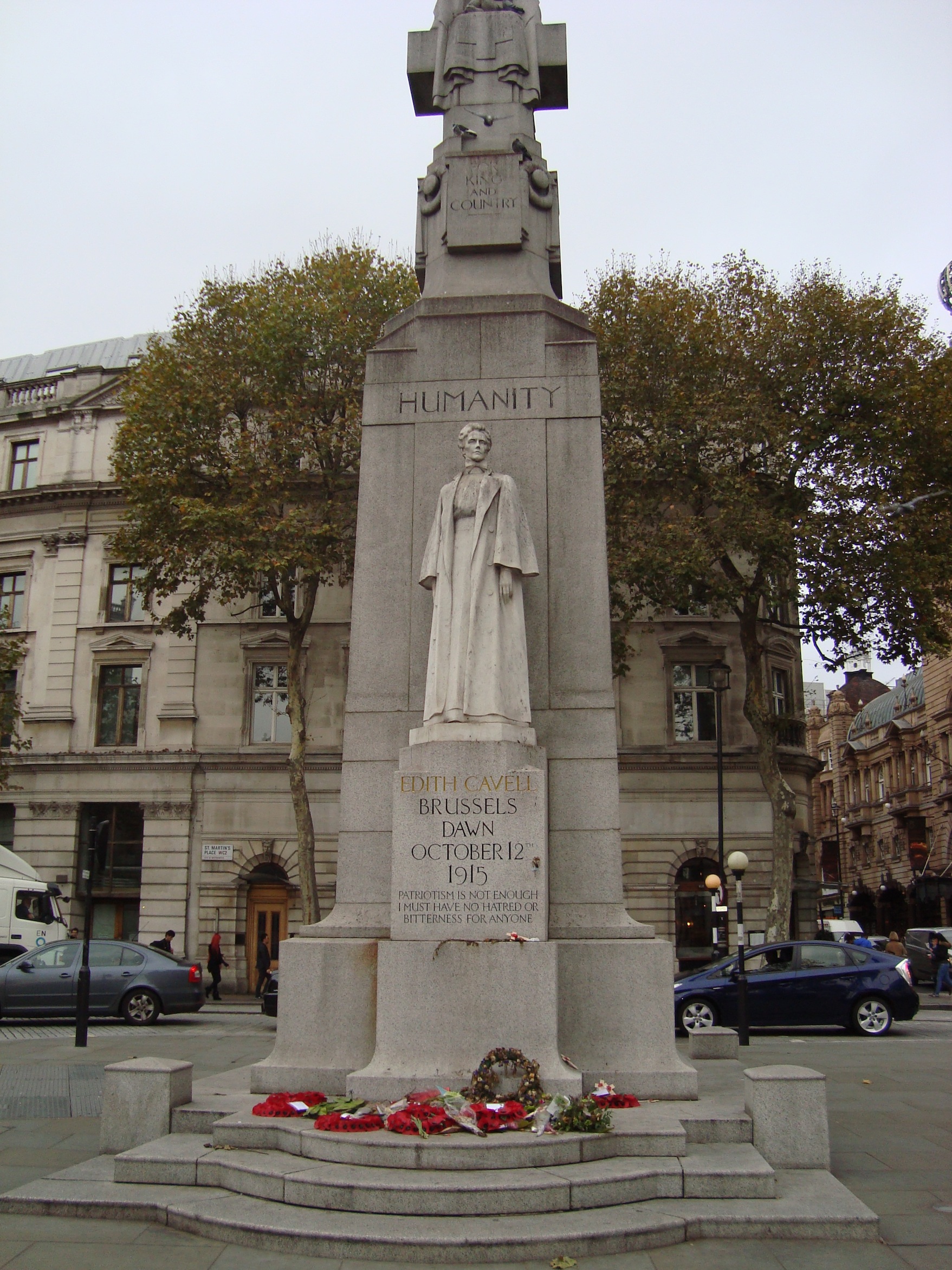 Edith Cavell (1865-1915), nurse, bronze memorial bust, stone plinth, the soldier seems to take rather more prominence than Edith herself. Designed 1915, unveiled 1918.